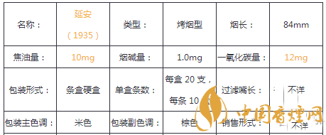 在了解了延安香煙最貴的多少錢之后,為了大家能更詳見的了解此煙,小編特意將延安1935香煙的核心參數(shù)進行了整理,以便于對它進行更深入的了解。