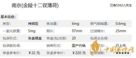 南京金陵十二釵薄荷煙外觀清新典雅,以淡綠色為主色調(diào),配以金陵十二釵美人圖,格調(diào)清新淡雅。整個(gè)煙包精致優(yōu)雅,煙支纖細(xì)超長別致,個(gè)性鮮明,煙香優(yōu)雅而飄逸,口感細(xì)膩柔和,超低的焦油量,勁道適中,價(jià)格適宜。深受廣大煙民的喜愛,特別是女性煙客對(duì)它格外青睞。據(jù)小編調(diào)查得知市場銷售參考價(jià)為22元/包