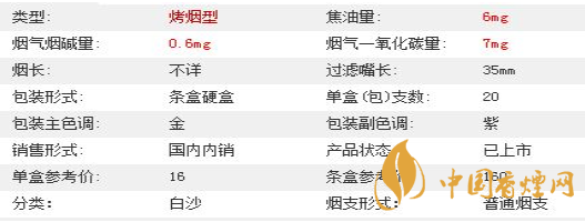 | 類(lèi)型 :烤煙型 | 焦油量 :6mg | 煙氣煙堿量 :0.6mg | 一氧化碳量 :7mg |