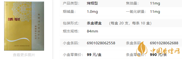 | 類型 :烤煙型 | 焦油量 :12mg | 煙氣煙堿量 :1.1mg | 一氧化碳量 :12mg |