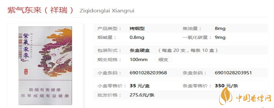 紫氣東來祥瑞煙支長100mm,過濾嘴長35mm,定位在細支煙品類。通過采用低溫保香,多級復配等特色工藝,使產(chǎn)品煙草本香更加突出,抽吸的均勻性更加穩(wěn)定,使消費者在享受煙草香氣的同時,又能體味自然舒適的感覺。下面我們一起來看紫氣東來祥瑞的參數(shù)信息:焦油量:8mg煙堿量:0.8mg一氧化碳量:9mg。