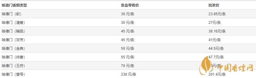 哈德門(mén)產(chǎn)品系列共有八種香煙產(chǎn)品,其中除了哈德門(mén)(壹號(hào))每條零售價(jià)是230元之外,其他的七種香煙產(chǎn)品,條盒零售價(jià)基本都是在30至55元之間,由于每條10盒,所以,每小盒的價(jià)格即在3至5元左右??梢?jiàn),哈德門(mén)香煙的價(jià)格是比較低廉的,也符合它“民品之名品”的稱號(hào)。