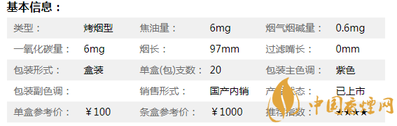 | 煙長(zhǎng):84mm | 過(guò)濾嘴長(zhǎng):25mm | 包裝形式:條盒硬盒 | 單盒(包)支數(shù):20 |