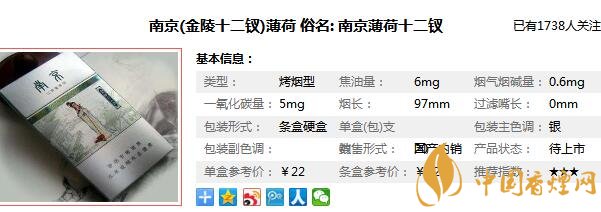 南京卷煙是江蘇中煙南京卷煙廠的代表品牌,而南京薄荷味香煙就是南京(金陵十二釵)薄荷,“金陵十二釵”香煙由南京卷煙廠在1988年出品,是非常少見的12包裝成套系列的產(chǎn)品,在煙標(biāo)收藏界,這套融詩、書、畫于一體的“金陵十二釵”被視為設(shè)計最精美的煙標(biāo),那么在對南京薄荷味香煙價格圖片分析之前,先來看看這款南京薄荷味香煙多少錢,它的售價為22元/包。