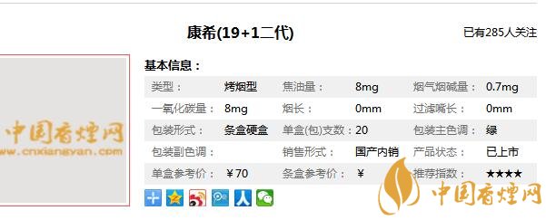 康希香煙是我國早期使用的科技降害典范香煙,這款康希一(19+1),現(xiàn)如今也是退出市場了,但是這款香煙也是作為中國煙草技術進步的一個開始,那么康希香煙多少錢一包,現(xiàn)在就由香煙網(wǎng)小編為大家介紹一下康希香煙價格圖片。
