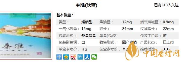 秦淮香煙系江蘇中煙出品,烤煙型香煙,由于種種原因,現(xiàn)如今這個品牌的香煙已經(jīng)退出市場了,先如今留給后人的只有懷念,這也是中國煙草市場不變的定律,那么在對秦淮香煙價格表進行介紹之前,先來看一看這款秦淮煙多少錢一包,這款秦淮(軟藍)的售價為2元/包。