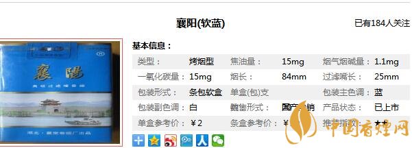 襄陽(yáng)牌香煙在上世紀(jì)80年代,這個(gè)品牌在當(dāng)時(shí)襄樊的招牌,隨著時(shí)間的變化,這個(gè)品牌也是逐漸退出了煙草市場(chǎng),這也是中國(guó)煙草市場(chǎng)不變的定律,后來(lái)襄陽(yáng)煙廠被武漢兼并了,這個(gè)品牌也隨之沒(méi)落了,那么在介紹襄陽(yáng)牌香煙價(jià)格表之前,先來(lái)看看這款襄陽(yáng)牌香煙多少錢(qián)一包,這款襄陽(yáng)(軟藍(lán))的售價(jià)為2元/包。