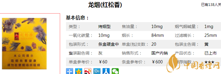 獨(dú)特的紅松香爆珠口味十分罕見,龍煙(紅松香)2017年中國喜慶產(chǎn)業(yè)十大領(lǐng)袖品牌,抽下來煙友表示優(yōu)點(diǎn)淡,適合新手。