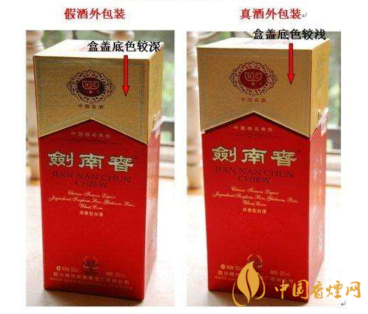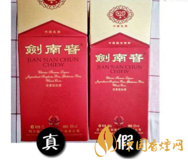 二、重點(diǎn)從商標(biāo)標(biāo)簽上鑒別1、 真品劍南春酒標(biāo)簽主要特征:(1)正標(biāo)標(biāo)簽上“劍南春”三個(gè)字,“注冊(cè)商標(biāo)標(biāo)識(shí)、外花邊”、“jian nan chun chiew”劍南春酒拼音均有凸凹感,印刷套印比較準(zhǔn)確,線條清晰,字體邊緣不毛,輪廓清楚。(2)小字體:酒精度、凈含量、廠名、廠址和簡(jiǎn)介,這些字體很清晰、均勻、無(wú)斷裂,邊緣顏色協(xié)調(diào)。(3)背標(biāo)標(biāo)簽:背標(biāo)標(biāo)簽鑒別主要從簡(jiǎn)介內(nèi)容及印刷字體入手,字體清楚、不毛邊,邊緣顏色協(xié)調(diào)。2、 假冒劍南春酒標(biāo)簽的特點(diǎn)(1) 正標(biāo)標(biāo)簽上凸凹感不明顯;(2)字體套印不準(zhǔn)確,線條不均勻,字體有毛邊和粗細(xì)不勻等現(xiàn)象;(3)小字體不清晰和模糊現(xiàn)象嚴(yán)重;(4)背標(biāo)標(biāo)簽邊緣顏色與背標(biāo)整體不協(xié)調(diào)。
