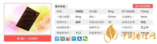 這三款細(xì)支煙的參數(shù)完全相同,具體參數(shù):一盒20支,煙長97mm,焦油量8mg,煙堿量0.6mg,一氧化碳量6mg。