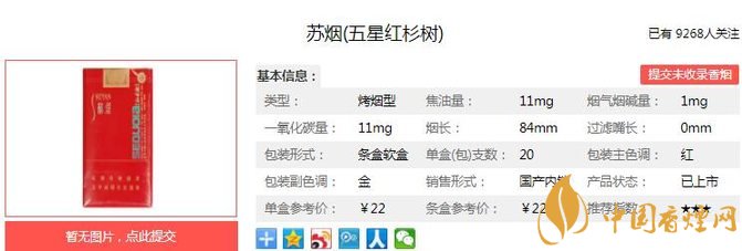 蘇煙五星紅杉樹產(chǎn)品包裝大膽采用全版電化鋁印刷技術(shù)及橫向的純字體裝飾,外觀設(shè)計(jì)簡約大方、時(shí)代感強(qiáng),喜慶、大方,與“蘇煙”系列產(chǎn)品風(fēng)格一脈相。經(jīng)香煙網(wǎng)小編市場調(diào)查蘇煙五星紅杉樹售價(jià)為22元/包。