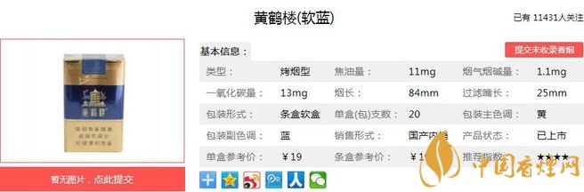 黃鶴樓軟藍(lán)煙支長84mm,過濾嘴長25mm,獨(dú)特加長煙棒有效過濾煙氣中有害物質(zhì),對人體危害更小,吸食更安全。下面我們一起來看黃鶴樓軟藍(lán)的參數(shù)信息:焦油量:11mg 煙堿量:1.1mg 一氧化碳量:13mg