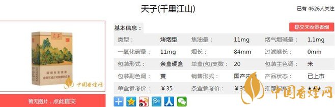 天子(千里江山)煙支長(zhǎng):84mm,烤煙型,包裝形式:條盒硬盒(每盒 20支,每條 10 盒)。當(dāng)年蔡京在《千里江山圖》上題詩(shī)“江山千里望無(wú)垠,元?dú)饬芾爝\(yùn)以神”,道不盡的酣暢淋漓。今天我們一起來(lái)看天子(千里江山)的參數(shù)信息:焦油量:11mg 煙堿量:1.1mg 一氧化碳量11mg