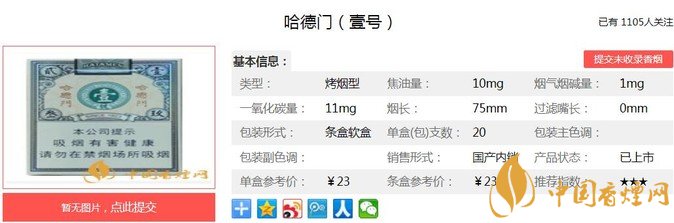 山東中煙是一個(gè)飽含人文情懷的企業(yè),哈德門(壹號(hào))穿越歷史煙云,尋覓最初的味道,致敬一段歷史,致敬一段情懷,重新上市。經(jīng)小編市場(chǎng)調(diào)查哈德門(壹號(hào))售價(jià)為23元/包。