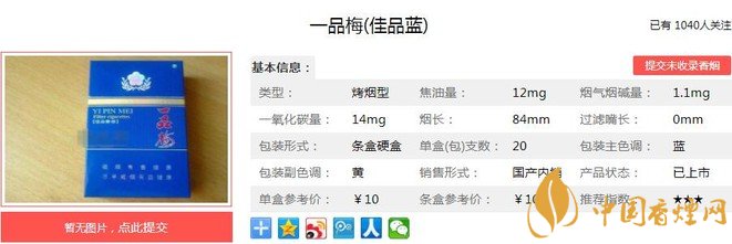 一品梅佳品藍(lán)煙支長84mm,過濾嘴長25mm,佳品藍(lán)煙支的水松紙為金黃色,顏色顯得略淺。煙絲填充還是比較密致的,嗅其味道,煙草的本香味明顯,略微帶些清香的調(diào)香味道。下面我們一起來看一品梅佳品藍(lán)的參數(shù)信息:焦油量:12mg 煙堿量:1.1mg 一氧化碳量:14mg