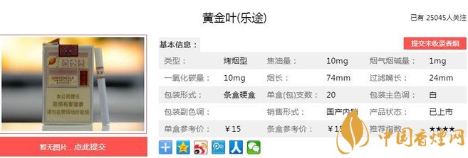 黃金葉樂途煙支長74mm,過濾嘴長24mm,煙支雖然短但滿足感一點都不弱,煙氣濃度、爆發(fā)力特別好,還兼具舒適感與輕松感,性價比高。下面我們一起來看黃金葉樂途的參數(shù)信息:焦油量:10mg 煙堿量:1.0mg 一氧化碳量:10mg