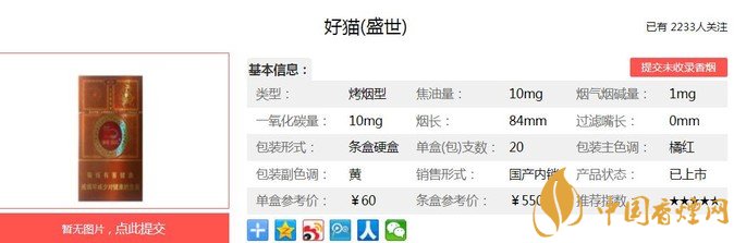 好貓盛世以高香低危害為主要設計方向,主要原料精心選用自然醇化兩年以上的云南、津巴布韋煙葉,突出產品優(yōu)雅的清香,煙香豐富諧調。在香料配方中首次采用具有生物減害技術的中草藥“豐和液”,使有害氣體得以轉移降解,達到了“生津不起痰,回甜不口干”的良好效果。經香煙網小編市場調查好貓盛世售價為60元/包。