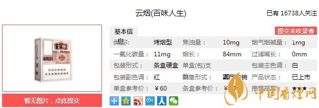 云煙百味人生優(yōu)選世界香料,取典型天然香韻,提取爆珠,賦予獨(dú)特香味風(fēng)格吸味,與本香完美融合。選擇捏爆爆珠,感受爆珠香氣與煙草本香完美融合帶來的獨(dú)特的風(fēng)格吸味,煙味醇厚,豐富甜潤,領(lǐng)尚五味。經(jīng)香煙網(wǎng)小編市場調(diào)查云煙百味人生售價為60元/包。