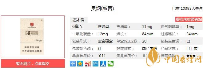 貴煙(新貴)是貴州中煙升級傳統(tǒng)卷煙配方,以創(chuàng)新柔性配方工藝,將技術(shù)創(chuàng)新與精致美感完美結(jié)合、精心打造的全新產(chǎn)品;貴煙(新貴)以精選的原料、精致的工藝、精純的口感,簡潔、明快的產(chǎn)品風(fēng)格,演繹完美的新貴“精致”生活。經(jīng)香煙網(wǎng)小編市場調(diào)查貴煙新貴售價(jià)為11元/包。