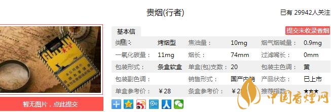 “貴煙(行者)”是“貴煙”旗下的首款短支爆珠煙。煙香不濃不淡,煙草的清香味道,醇正而清新。黃黑配色的醒目包裝、斜條紋帶來的西部公路感,都在把人引到一種豪放、自由的感覺之中。經(jīng)香煙網(wǎng)小編市場調(diào)查貴煙行者售價為28元/包。