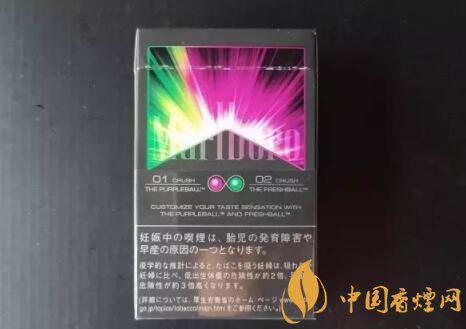 這盒煙是日版的,上面密密麻麻日文一堆,但兩顆珠子在包裝上還是很顯眼的,尤其是背面,還特別介紹了一下味道。