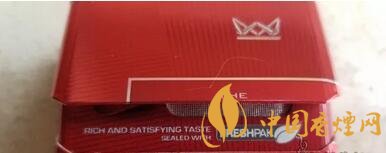 老版的Logo區(qū)以銀色勾框,Logo區(qū)頂部一部分在上蓋位置。由于煙盒卷折問題,這個(gè)Logo外框會(huì)有一定的錯(cuò)位。在Logo區(qū)下,有一條細(xì)細(xì)的銀色條帶,里面用白色印制有AMERICAN BLEND字樣。煙盒中部偏右,則有白色印制的RED字樣,顯示這款煙的煙款為紅標(biāo)。