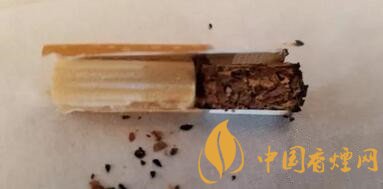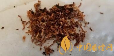 攤開煙絲,明黃、棕黃的烤煙煙絲比例較大,間雜有比例稍小的深棕色的晾煙煙絲,未見涂布制絲和膨脹制絲。里面混雜與切成薄片狀的煙梗。從煙絲外觀看,煙葉的品級非常好,用料實(shí)在。