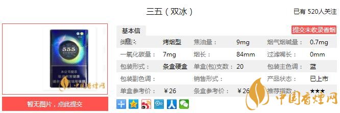 555牌卷煙創(chuàng)牌于1895年,創(chuàng)始人Albert Levy爵士在美國獲得靈感并在英國注冊State Express 555品牌,是英美煙草公司出品的有著悠久歷史的著名品牌,國內(nèi)煙民熟悉的有555金、555弘博、555環(huán)尊、555藍(lán)尚、555國際等品種和系列。555屬英式烤煙型卷煙。下面就由香煙網(wǎng)小編帶大家一起來了解三五雙冰的相關(guān)信息。