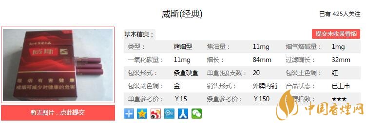 West(威斯)精選優(yōu)質(zhì)中國煙葉,輔以歐洲煙葉,并擁有獨(dú)特的碳芯濾嘴,口感醇順,香氣豐滿,煙氣細(xì)膩,口感舒適甜潤。威斯經(jīng)典就如他的宣傳語一樣:紅塔出品 全新威斯 分享真對(duì)味。經(jīng)香煙網(wǎng)小編市場(chǎng)調(diào)查威斯經(jīng)典售價(jià)為15元/包。