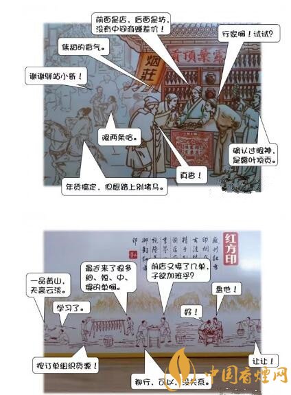 細(xì)看,正面的“前店”是一條古徽州商業(yè)街的圖樣,人頭攢動(dòng)、熙熙攘攘,掛著“露葉頂貢”招牌的紅方印煙莊占據(jù)了C位,門口的“文幫”掌柜手持一片煙葉接受眾人圍觀;背面的“后坊”,則描繪了“武幫”的手工匠人們曬煙、制絲的勞作場(chǎng)景??上D案只能繪色、不能繪聲,假如身臨其境,會(huì)聽(tīng)到什么樣的聲音呢?惡搞一下吧……