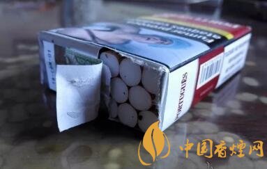 煙盒頂端貼制的葡萄牙完稅標簽。內(nèi)容樣式,與葡萄牙版本硬白金萬相同。