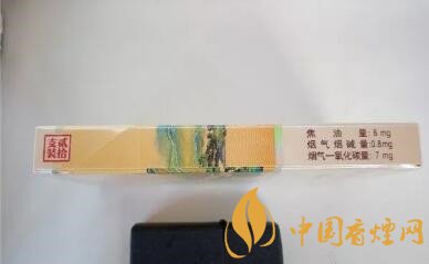 煙盒的左側(cè)連貫著圖案,下面是這款煙的理化指標:焦油量:8mg、煙氣煙堿量:0.8mg、煙氣一氧化碳量:7mg等,在左側(cè)上方還有類似印章一樣的正方形紅色字體,標明內(nèi)有貳拾支裝。