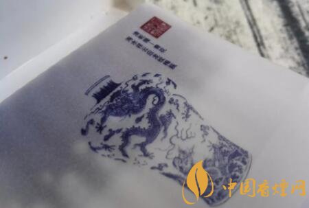 先來欣賞一下煙盒內(nèi)里的包裝設(shè)計特點(diǎn)。向上掀開合蓋,會發(fā)現(xiàn)上蓋內(nèi)里印有數(shù)條騰龍圖案,以及china瓷字樣。