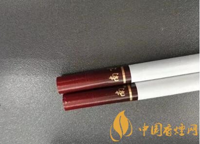 從盒子里面抽出兩支煙來,放置于桌上,觀之,煙嘴的顏色和煙盒的顏色也是一樣,采用了漸變色,紅褐色的煙嘴中間有兩排不怎么明顯的降焦孔。煙嘴的長度為32毫米,而整個煙支的長度還是普通的84毫米。煙嘴下部有南京二字和印有古都兩個字的印章圖案。一道閃閃發(fā)光的金箍環(huán)繞著整個煙嘴。