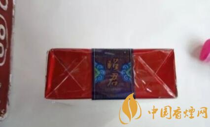 煙盒頂部有藍(lán)色條紋的封簽紙,上面寫著昭君二字,旁邊是一些特色花紋點綴。底部就簡單了,大青山的logo,山還是用象形字表示的。