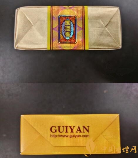 頂部可見(jiàn)內(nèi)襯紙為淺金色,彩色的國(guó)酒香封簽條亦是顯得比較活潑。底部則印著貴煙的拼音與網(wǎng)址。