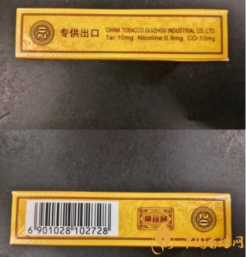 煙盒的兩側(cè)都有用到葉狀的底紋裝飾,左側(cè)用中文標(biāo)注了專(zhuān)供出口的身份,而貴煙公司名稱(chēng)和理化指標(biāo)都用英文替代,焦油10mg/尼古丁0.9mg/一氧化碳10mg,數(shù)值不高不低。右側(cè)則印著中文的國(guó)酒香品名和商品條碼,掃碼并未顯示出口何地。