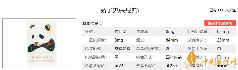 嬌子功夫經(jīng)典煙支長97mm,過濾嘴長:25mm,“香草增香遮蓋技術(shù)”可以遮蓋煙草燃燒后吸附在身體、室內(nèi)、車內(nèi)的煙味,同時凸顯出煙草與甜香草協(xié)調(diào)的香味特點(diǎn),較好地體現(xiàn)出香味型中式卷煙創(chuàng)新產(chǎn)品特色。下面我們一起來看嬌子功夫經(jīng)典的參數(shù)信息:焦油量:8mg 煙堿量:0.9mg 一氧化碳量:8mg
