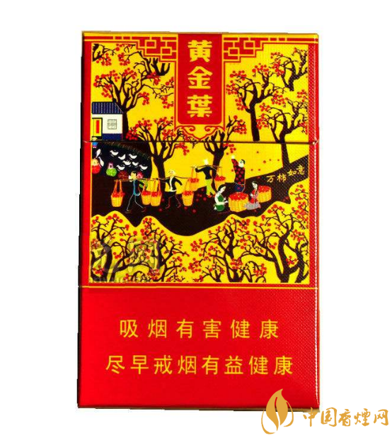 黃金葉(萬柿如意)又名黃金葉(金如意),它是一款充滿了鄉(xiāng)土氣息的產品。品名萬柿如意,諧音萬事如意,傳遞出了一種美好的祝福,比較適合一些喜慶的時刻,那到底是不是一款好煙呢,當然要抽才知道! 正面包裝一眼看過去很是花哨,仔細一看,首先給人一種喜慶的感覺,三分之二的正面被一副萬柿圖覆蓋,圖案的底色為黃色,上面有成熟的紅色的柿子,還有農民挑著收割好的柿子回家的繁榮景象,鄉(xiāng)土氣息,繁榮氣息,喜慶氣息很是濃郁,盒子上部的中央豎款的黃金葉三字真可謂是畫龍點睛。