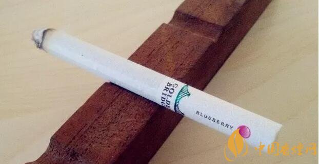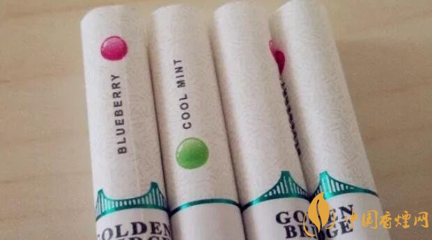 國(guó)產(chǎn)爆珠香煙金橋煙支上一道綠箍,一座綠色的金門(mén)大橋坐落其上,暗示了這包煙即使不爆珠也自帶的涼味。水松紙上有爆珠示意圖,靠唇端是紫紅色的藍(lán)莓,靠煙絲端是翠綠色的薄荷。又要用圓點(diǎn)顯示爆珠位置,又要用英文字母標(biāo)注爆珠口味,如果同處一側(cè)將顯得擁擠,因此二者分居濾嘴兩側(cè)錯(cuò)開(kāi)。煙支上沒(méi)有漢字,GOLDEN BRIDGE、BLUEBERRY和COOL MINT,營(yíng)造出了外煙的既視感。