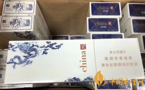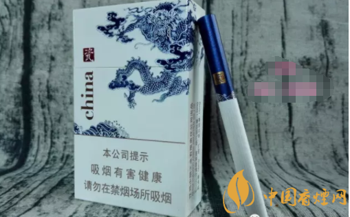 煙盒正面主圖為青花騰龍?jiān)煨?,張牙舞爪,欲入深海而攪起驚濤駭浪。煙盒頂端,印有青花瓷瓶的圖案,同時(shí)加以文字簡(jiǎn)介。煙盒底端主色調(diào)為深藍(lán),與正反兩面的藍(lán)色青花龍色調(diào)相輔相成。China和瓷的品名,再次印制于此部位。H103,是指產(chǎn)品的隨機(jī)編號(hào)。