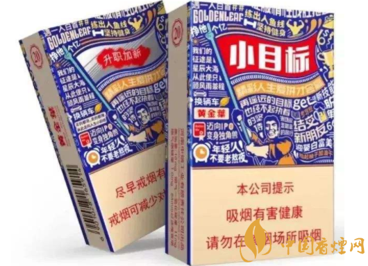 “先吸一口,再掙他一個(gè)億”小目標(biāo)的這句伴隨語(yǔ)就充滿了正能量。這些包裝上的小目標(biāo)跟現(xiàn)在年輕人的理想也完美契合,牢牢的抓住了年輕受眾的心 。喜歡類(lèi)似的煙,可以是搜黃鶴樓三口品,白沙天天向上。屬于青年定位的口糧。以上就是香煙網(wǎng)小編為大家整理介紹的關(guān)于黃金葉小目標(biāo)香煙的相關(guān)信息,更多了解點(diǎn)擊: