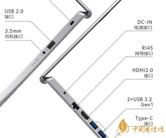 在接口方面,這款筆記本還是比較豐富的,主要的接口有1個全功能的type-c,2個usb3.2 Gen1,1個usb2.0,1個rj45網(wǎng)線接口,1個耳麥接口,1個HDMI2.0,詳細(xì)的接口圖如下: