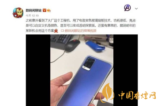 數(shù)碼博主數(shù)碼閑聊站在微博展示了一款可以進(jìn)行機(jī)身自定義變色的手機(jī)。并表示這款新機(jī)采用了電致變色玻璃背板技術(shù),功耗很低,亮點是可以自定義機(jī)身顏色,甚至可以變成透明探索版。