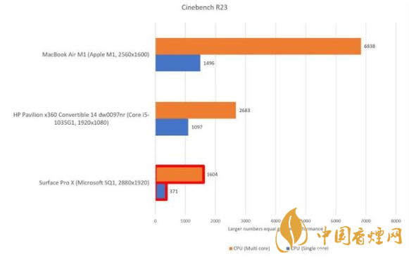 Maxon 的 Cinebench 的結(jié)果顯示 M1 也占據(jù)了絕對的領(lǐng)先優(yōu)勢,單核和多核成績分別為 1496 分和 6838 分,輕松擊敗 Surface Pro X 的 371 分和 1604 分。