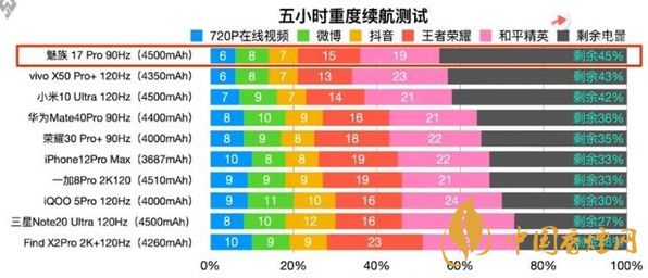 這次測(cè)評(píng)主要通過對(duì)720P在線視頻、刷微博,抖音,打王者榮耀和平精英等日常應(yīng)用進(jìn)行測(cè)試,得出了5G旗艦的五小時(shí)重度續(xù)航排名。其中,續(xù)航最好的機(jī)型是魅族17 Pro,經(jīng)過五小時(shí)的重度測(cè)試,該機(jī)還剩下45%的電量。