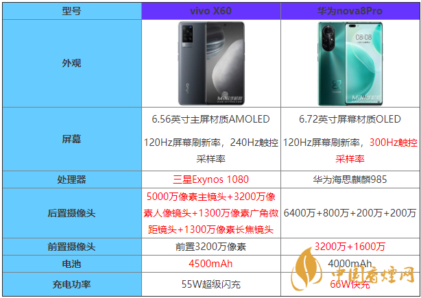 近期迎來vivoX60的發(fā)布,吸引大家目光的同時,華為nova8Pro也格外引人注目,vivoX60和華為nova8Pro那個好,下面香煙網(wǎng)小編將對vivoX60和華為nova8Pro參數(shù)對比進(jìn)行介紹,感興趣的朋友一起來看看吧!