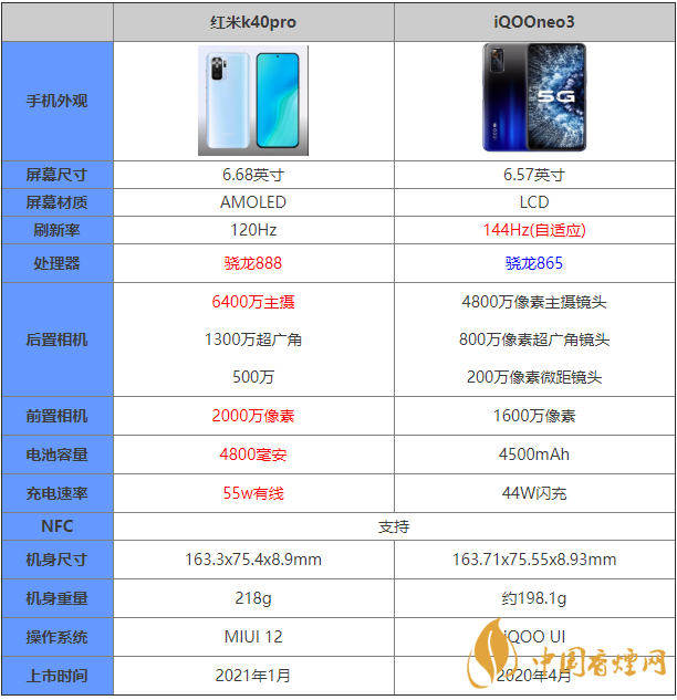 紅米k40pro這款手機(jī)可將會(huì)是最為便宜的驍龍888手機(jī),那么這款手機(jī)和iQOOneo3相比較的話到底是誰占有著更加優(yōu)秀的性能表現(xiàn),哪款手機(jī)更值得入手?下面香煙網(wǎng)小編將為大家介紹這兩款手機(jī)的參數(shù)對(duì)比情況,感興趣的朋友一起來看看吧!