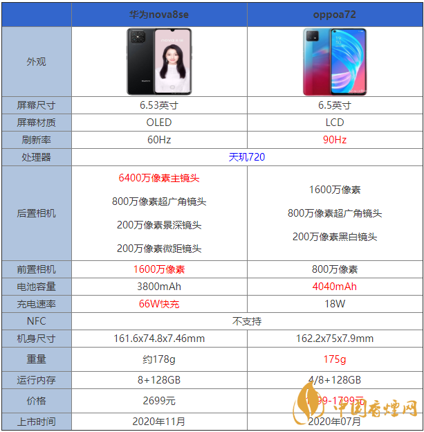 華為nova8se和oppoa72兩款手機(jī)都是采用了相同的處理器,那么在這兩款手機(jī)中到底是哪一款有著更加好的性能呢?哪款手機(jī)更值得入手?接下來香煙網(wǎng)小編將對(duì)華為nova8se和oppoa72參數(shù)對(duì)比進(jìn)行介紹,一起來看看吧!