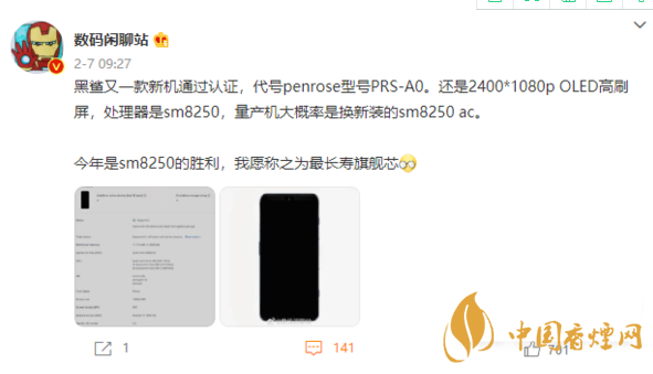“黑鯊又一款新機通過認證,代號penrose型號PRS-A0。還是2400*1080p OLED高刷屏,處理器是sm8250,量產(chǎn)機大概率是換新裝的sm8250 ac。”